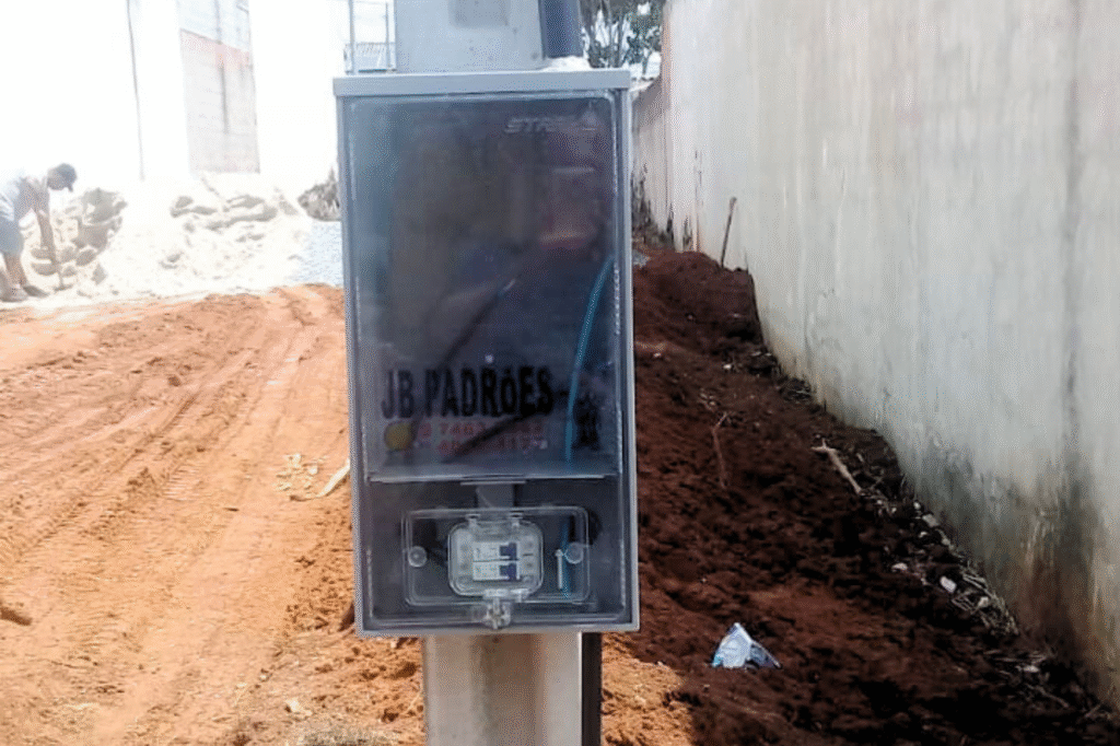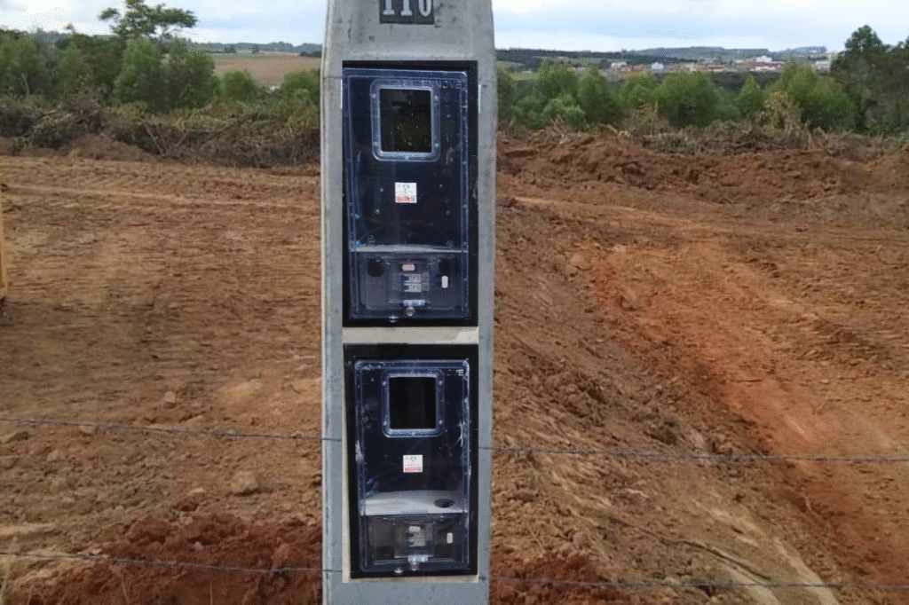 O poste possui caixa de medição e proteção incorporadas. As tubulações de entrada dos ramais são individuais e embutidas no corpo de concreto.